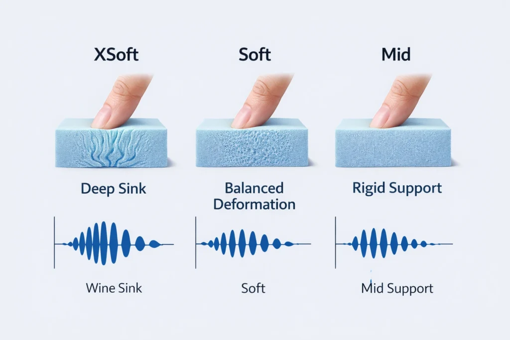 | Hardness (Shore A) | 5–10A (very soft) | 30–50A (stiffer) |